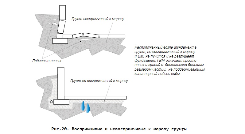 Из предыдущих страниц данной темы сайта нам известно, что разные грунты имеют различные свойства. Одни из них при замораживании не изменяют своей структуры, другие увеличиваются в объеме и выталкивают фундамент ломая его в различных плоскостях. Назовем такие грунты восприимчивыми к морозу и невосприимчивыми.