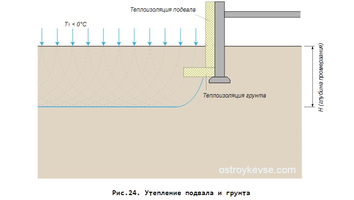 Если вы встретите чертежи, показывающие теплоизоляцию по внешней вертикальной стене фундамента, то это утепляется подвальное помещение, а не грунт. Такая теплоизоляция удерживает тепло в подвале, при этом грунт теплом дома не прогревается, и глубина его промерзания не изменяется. То есть теплоизоляция стен фундамента не имеет ничего общего с теплоизоляцией грунта. Это разные конструктивные решения решающие разные задачи.