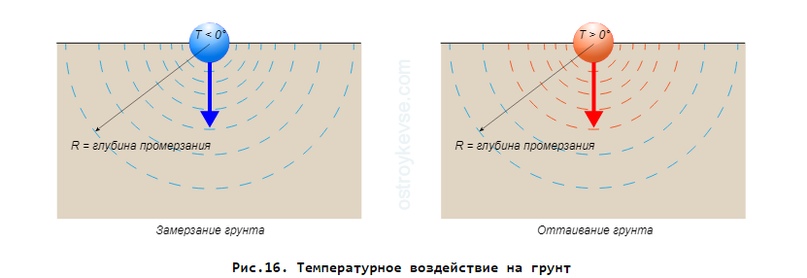 Весной шарик нагревается и начинает расплавлять под собой замороженный грунт. То есть происходит тот же самый процесс, что и при замораживании, только вектор температуры меняет свой знак с минуса на плюс. Если теплых дней будет мало, то грунт не успеет растаять на всю глубину, на которую он промерз. Такой грунт называется вечномерзлым. Сейчас мы его рассматривать не будем. Далее нас интересует только тот грунт, который в летние дни полностью прогревается.