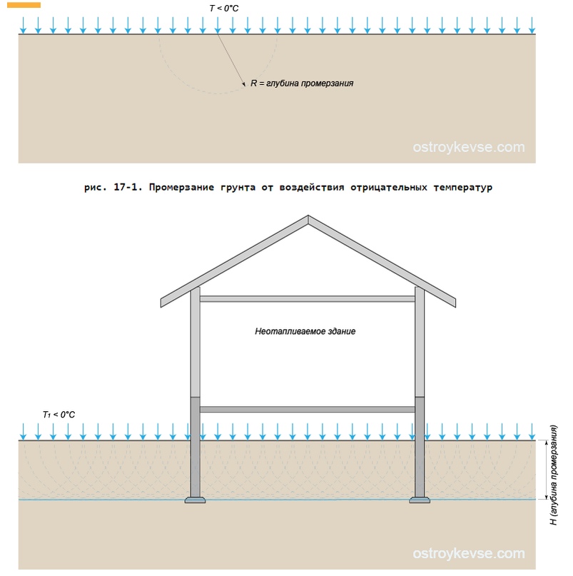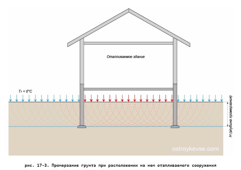 рис. 17-2. Промерзание грунта при расположении на нем неотапливаемого сооружения